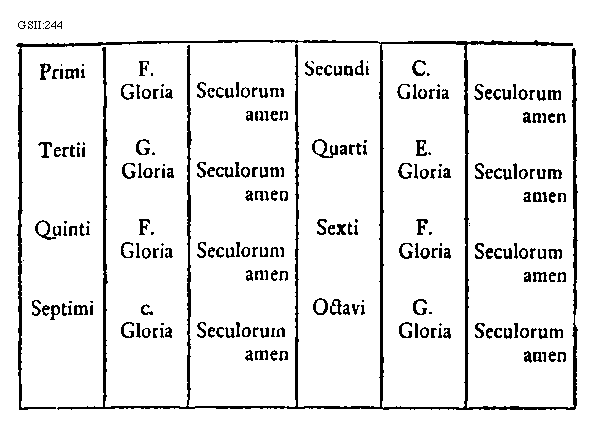 [244][GSII:244; text: Primi, Tertii, Quarti, Quinti, Sexti, Septimi, Octavi, Gloria, Seculorum amen, C. E. F. G. c.]