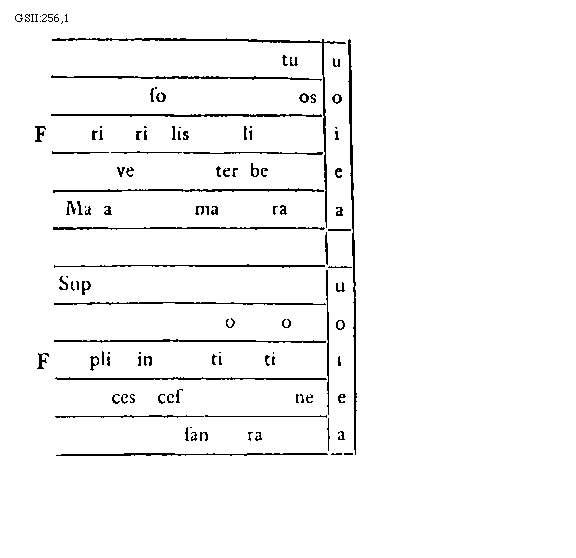 [255][GSII:255; raro, libere, Modi, I, II, III, IIII, V, VI, VII, VIII, [Gamma], A, B, C, D, F, G, a, b, [sqb], c, d, e, f, g, aa, [sqb][sqb]]