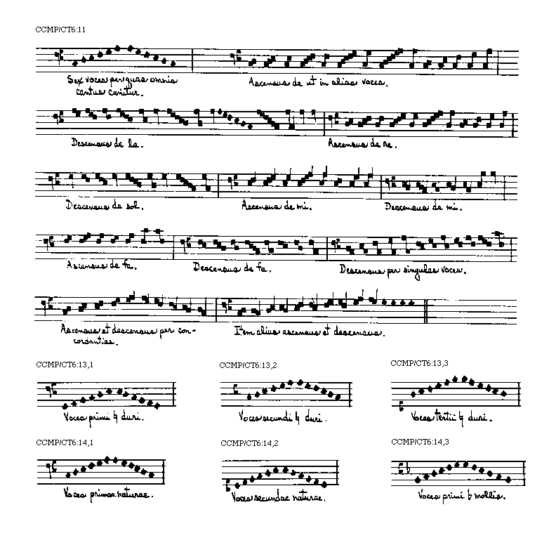 [CCMP/CT6:11; text: Sex voces per quas omnis cantus canitur. Ascensus de ut in alias voces. Descensus de la. Ascensus de re. Descensus de sol. Ascensus de mi. Descensus de mi. Ascensus de fa. Descensus de fa. Descensus per singulas voces. Ascensus et descensus per concordantias. Item alius ascensus et descensus.]