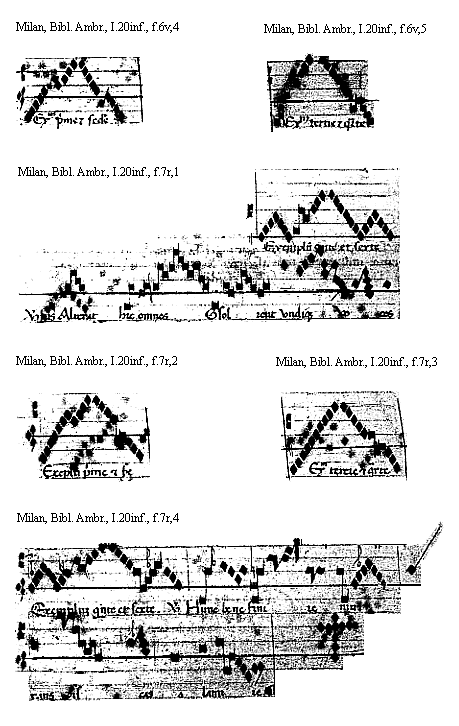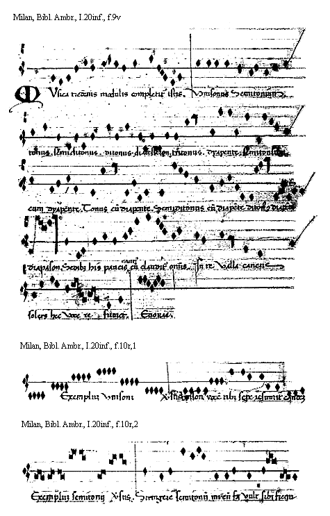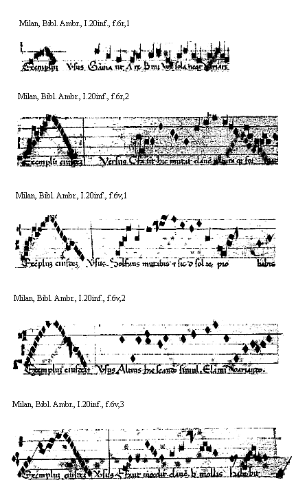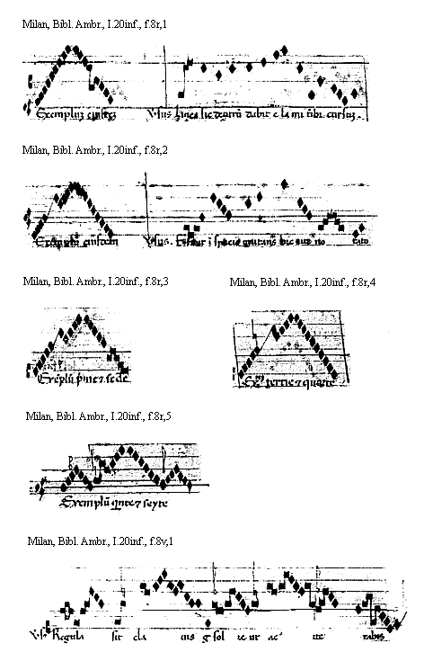 [Milan, Bibl. Ambr., I.20.inf., f.4r; text: Sex voces per quas omnis cantus canitur., Ascensus de vt in alias voces., Descensus de la., Ascensus de re., Descensus de sol., Ascensus de mi., Descensus de mi, Ascensus de fa., Descensus de fa., Descensus per singulas voces., Ascensus et descensus per concordantias., Item alius ascensus et descensus.]