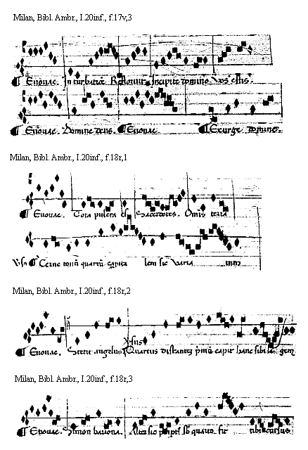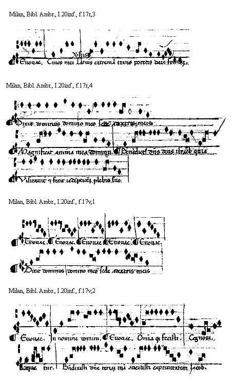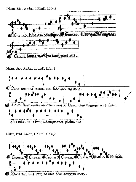 [Milan, Bibl. Ambr., I.20.inf., f.23r,3; text: Euouae. In excelso Introduxit. Lux, Dum medium, versus Iubilate deo omnis terra seruite domino in letitia]
