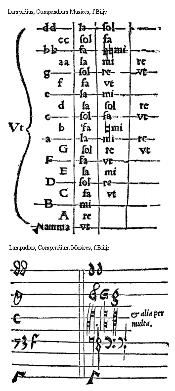 [Lampadius, Compendium Musices, f.Bijv,2, text: Qua ratione dicuntur. Supremae? Geminatae? Excellentes? ratione positionis quod geminatis literis scribuntur quia caeteras omnes suo sono excellunt]