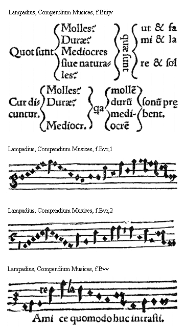 [Lampadius, Compendium Musices, f.Biiijv; text: Quot sunt, Molles? Durae? Mediocres siue naturales? quae sunt, ut et fa, mi et la, re et sol, Cur dicuntur. Mediocres, quia, mollem, durum, mediocrem, sonum praebent]