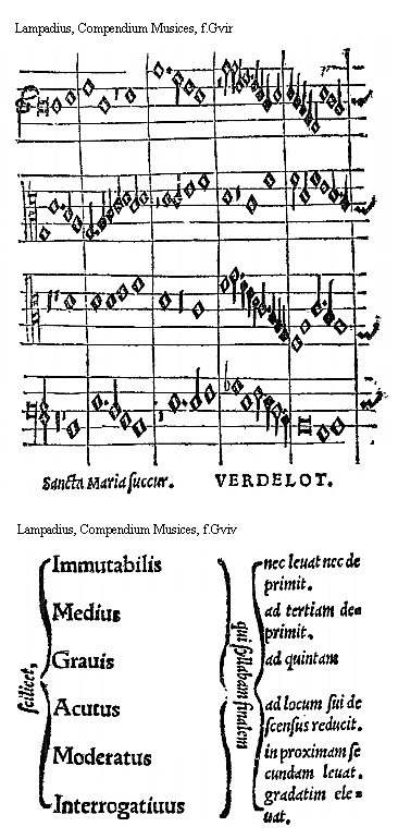 [Lampadius, Compendium Musices, f.Gviv; text: scilicet, Immutabilis, Medius, Grauis, Acutus, Moderatus, Interrogatiuus, qui syllabam finalem, nec leuat nec de primit. ad tertiam deprimit. ad quintam, ad locum sui de scensus reducit. in proximam secundam leuat. gradatim eleuat.]