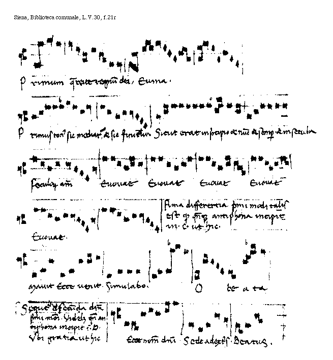 [Siena, Biblioteca comunale, L.V.30, f.21r; text: Primum qauereite regnum dei. Euma. Primus tonus sic mediatur et sic finitur. Sicut erat in principio et nunc et semper et in secula seculorum amen Euouae. Prima differentia primi modi talis est quod quandoque antiphona incipit in .c. ut hic. mauit Ecce uenit. Simulabo. O beata, Sequitur de secunda differentia primi modi. Videlicet quando antiphona incipit in D. Verbi gratia ut hic, Ecce nomen domini. Sede a dextris. Beatus.]