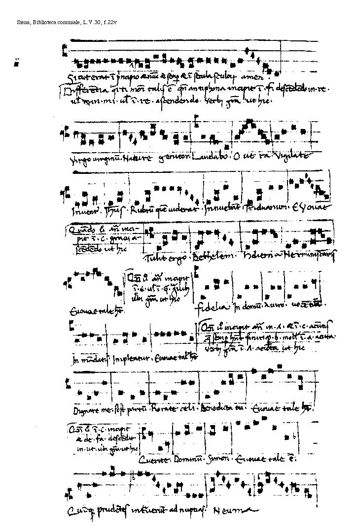 [f.22v][Siena, Biblioteca comunale, L.V.30, f.22v; text: Sicut erat in principio et nunc et semper et in secula sculorum amen. Differentia quarti modi talis est quando antiphona incipit in .F. descendendo in .re. uel [[mi]] in .mi. uel in .re. ascendendo. Verbj gratia ut hic. Virgo uirginum. Nature genitor. Laudabo. O uera. Vigilate. Inuentus. Iesus. Rubrum quem uiderat. Innuebant. Triduanum. EVouae. Quando uero antiphona incipit in .C. grauj ascendendo ut hic, Tulit ergo. Bethelem. Hodierna. Herminis caris Euouae tale habet. Quando uero antiphona incipit in .e. uel in .G. grauibus uerbi gratia ut hic, Fidelia. In domum. A uiro. uocem tuem. In mandatis. Impleatur. Euouae. talis habet, Quando uero incipit antiphona in .A. et in .C. acutis quae semper habent finiti per .b. mollem in .a. acuta. Verbj gratia in A acuta ut hic, Dignare me. Post partum. Rorate celi. Benedicta tu. Euouae tale habet, Quando uero in .C. incipit et de .fa. descendit in .ut. uerbi gratia. ut hic, Querite. Dominum. Simon. Euouae tale est. Quinque prudentes intrauerunt ad nuptias. Neuma]
