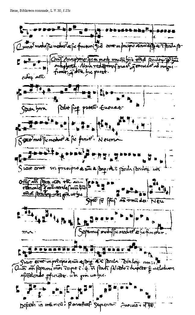 [f.23r][Siena, Biblioteca comunale, L.V.30, f.23r; text: Quintus modus sic mediatur et sic finitur. Sicut erat in principio et nunc et semper et in secula seculorum amen. Omnes antiphone quinti modj unicum habent tantummodo seculorum preter hanc antiphonam. Alma redemptoris mater quae cantatur ad magnificat, quae differentia hic patet. Sexta hora sedit super puteum. Euouae. Sextus modus sic mediatur et sic finitur. Neuma, Sicut erat in pricipio et nunc et semper, et in secula seculorum amen, Omnes antiphone sexti modi tam autenticales quam collaterales unum habent tantummodo seculorum. uerbi gratia ut hic, Septem sunt spiritus ante tronum dei. Neuma, Septimus modus sic mediatur et sic finitur. Sicut erat in principio et nunc et semper et in secula seculorum amen. Quando antiphona septimi modi incipit in .G. non statim saliendo in diapente sed melodion ascendendo perficiente. uerbi gratia ut hic. Descendi in ortum meum. Pontifices. Sapientiam. Euouae talis habet.]