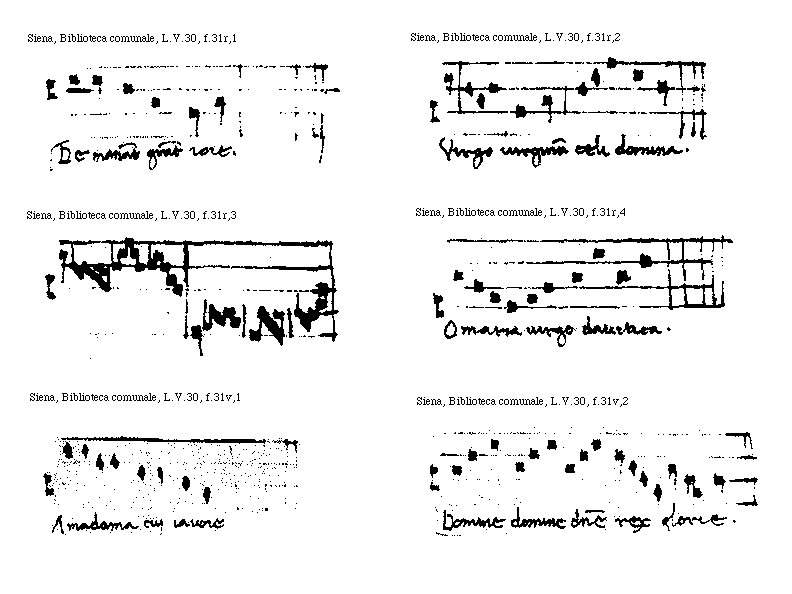 [Siena, Biblioteca comunale, L.V.30, f.30v,3; text: O Maria beata genitris.]