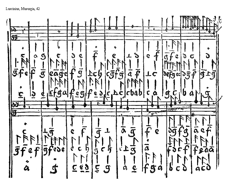 [Luscinius, Musurgia, 37; text: f, g, a, b, c, d, e, h, cc, dd, ee, ff, gg]