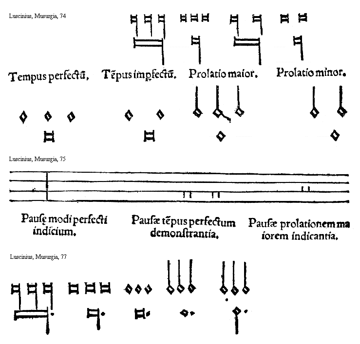 [Luscinius, Musurgia, 75; text: Pausae modi perfecti indicium. Pausae tempus perfectum demonstrantia. Pausae prolationem maiorem indicantia.]