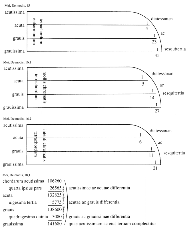[Mei, De modis, 23,2; text: acutissima, acuta, grauis, grauissima, intenti diatoni tetrachordum, diatessar[Omega]n ac sesquitertia, 1/9, 1/8, 1/15]