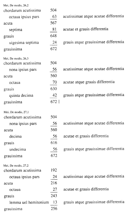 [Mei, De modis, 18,3; text: chorda acutissima, 106260, sexta acutissimae, 17710, acuta, 123970, undecima acutae, 11270, grauis, 135240, uigesima prima, 6440, grauissima, 141680, tetrachordum ac diatessar[Omega]n, acutissimae atque acutae differentia, acutae ac grauis differentia, grauis atque grauissimae differentia, quae acutissimam ac eius tertiam complectitur]