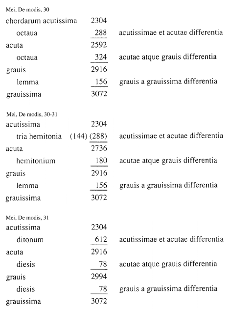 [Mei, De modis, 30,2; text: acutissima, 2304, tria hemitonia, (144) (288), acuta, 2736, hemitonium, 180, grauis, 2916, lemma, 156, acutissimae et acutae differentia, acutae atque grauis differentia, grauis a grauissima differentia]