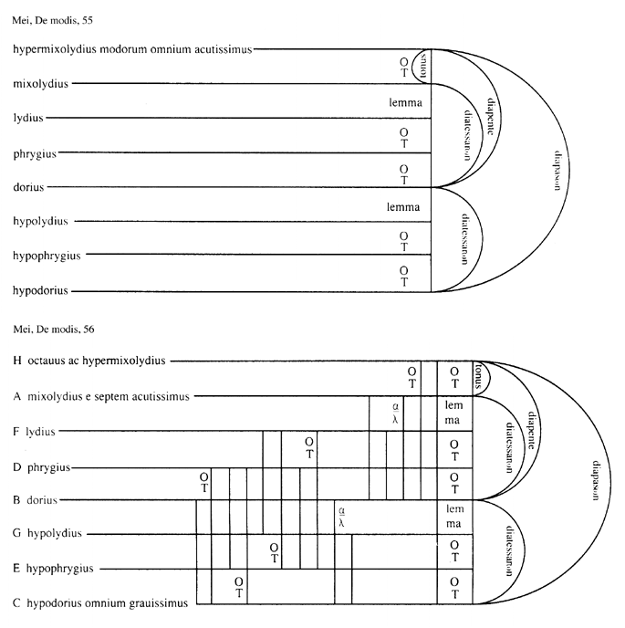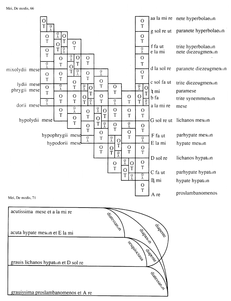 [123][Mei, De modis, 123, text: nete hyperbolae[Omega]n et aa la mi re, paranete hyperbolae[Omega]n et g sol re ut, trite hyperbolae[Omega]n, et f fa ut, paramese post synemmen[Omega]n et nete diezeugmen[Omega]n et e la mi, nete synemmen[Omega]n et paranete diezeugmen[Omega]n et d la sol re, paranete synemmen[Omega]n et trite diezeugmen[Omega]n et c sol fa ut, paramese et [sqb] mi, trite synemmen[Omega]n et b fa, mese et a la mi re, lichanos mes[Omega]n et G sol re ut, parhypate mes[Omega]n et F fa ut, hypate mes[Omega]n et E la mi, lichanos hypat[Omega]n et D sol re, parhypate hypat[Omega]n et C fa ut, hypate hypat[Omega]n et B mi, proslambanomenos siue prosmelodos et A re, Tonus, [leimma], mixolydia formae disiunctionis, interuallum, contrariae mixolydia formae disiunctionis, duorum tetrachordorum coniunctorum interuallum, diapas[Omega]n consonantiae integrum spatium]