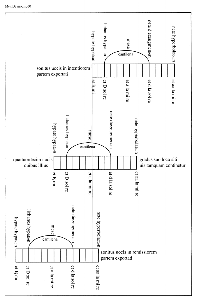 [13][Mei, De modis, 13; text: apycnos, oxypycnos, mesopycnos, barypycnos, [apuknos] proslambanomenos, Diatonum intentum, Diatonum molle, Chroma toniaeum, Chroma hemiolion, Chroma [malakon] molle, Enharmonium, aa la mi re stabilis, g sol re ut mobilis, f fa ut mobilis, e la mi stabilis, d la sol re mobilis, c sol fa ut mobilis, [sqb] mi stabilis, a la mi re stabilis, G sol re ut mobilis, F fa ut mobilis, E la mi stabilis, D sol re mobilis, C fa ut mobilis, B mi stabilis, A re stabilis, hyperbolae[Omega]n tetrachordum, diezeugmen[Omega]n tetrachordum, disiunctionis interuallum, mes[Omega]n tetrachordum, hypat[Omega]n tetrachordum, epogdous, 6, 8, 9, 12, 18, 24, 30, 36, 42, 44, 48]
