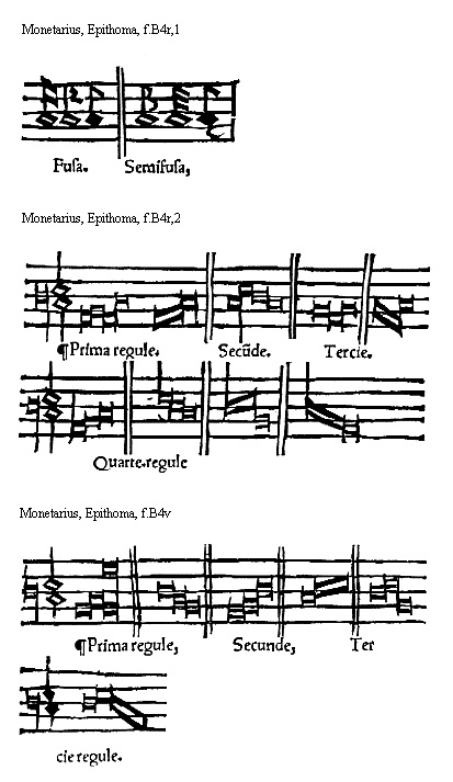 [Monetarius, Epitoma, f.B1v,2; text: vel signate et sunt hec quinque. ddlasol, g sol reut, csolfaut, Ffaut, [Gamma]ut, et figurantur hoc modo. In cantu meusurali hoc modo]