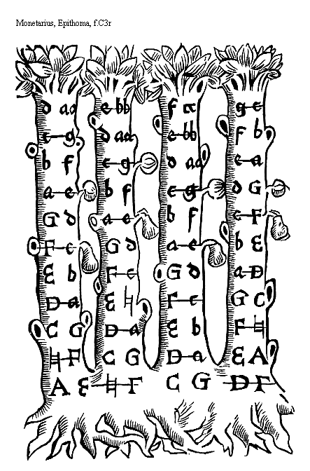 Singulorum igitur tonorum finis et reueberatio atque ambitus ex arbore vbertim consideratur. Que arbor isto modo debet intelligi, prima litterarum maneries: vnicuiusque trunci: continet systemata tam autentici quam sui plagalis secundum regularem ambitum. Secunda autem literarum maneries concludit systemata autentici et plagalis, ad quando tamtransposita: pomum enim semper autentici de signat reuerberationem pirum vero plagalis