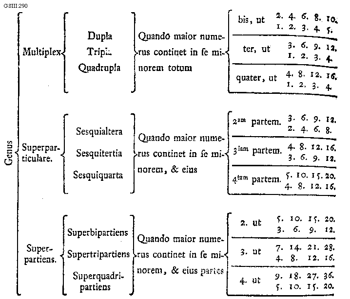 [GSIII:290; text: Genus, Multiplex, Superparticulare. Superpartiens. Dupla, Tripla, Quadrupla, Sesquialtera, Sesquitertia, Sesquiquarta, Superbipartiens, Supertripartiens, Superquadripartiens, Quando maior numerus continet in se minorem totum, Quando maior numerus continet in se minorem, et eius, Quando maior numerum continet in se minorem, et eius partes, bis, ut, ter, ut, quater, ut, secundam partem. tertiam partem. quartam partem. 1. 2. 3. 4. 5. 6. 7. 8. 9. 10. 12. 14. 15. 16. 18. 20. 21. 27. 28. 36.]