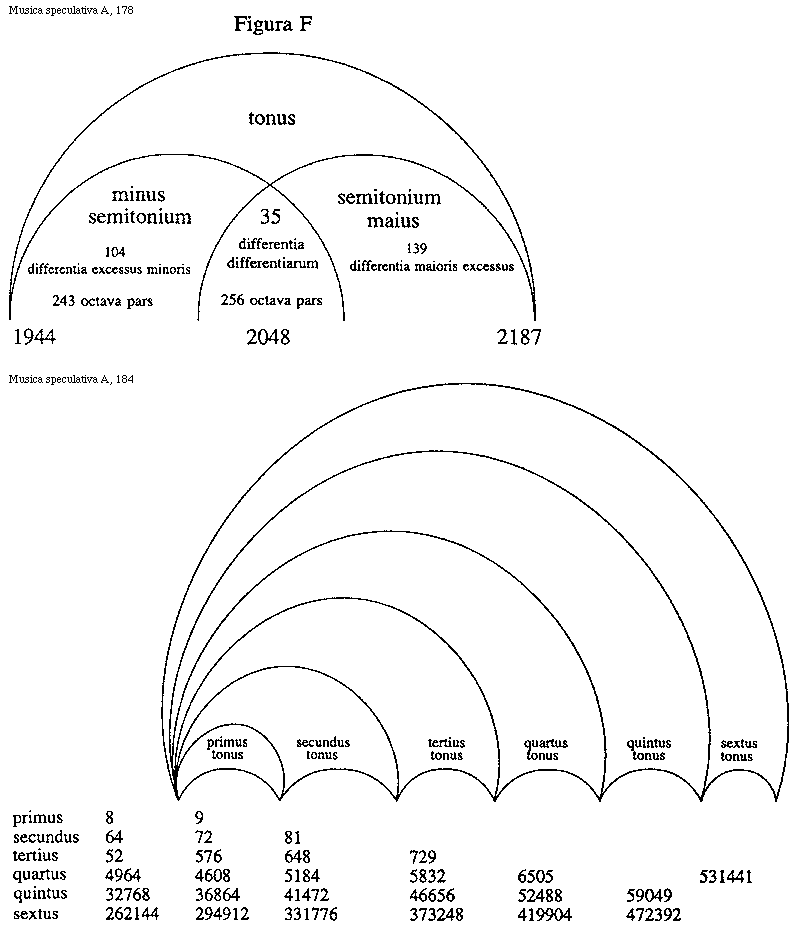 [198]diapason subtrahatur, reliquum est comma. Nam comma est differentia inter tonos quinque et duo semitonia minora, quae sunt in diapason per immediatam, et inter sex tonos. Quod provenit ex eo, quod ista duo semitonia tonum perficere nequierunt, verbi gratia: Hi duo numeri 262144 et 531441 sex tonos continuos amplectuntur, sed hi duo numeri 262144 et 524288 reddunt diapason, quod patet, si primus numerus dupletur. Modo differentia inter numerum sex tonorum et numerum diapason adimplentem est differentia 7153 et haec differentia est duorum minorum semitoniorum ad tonum. Nam si fuissent integra semitonia, differentia nulla fuisset; et haec differentia inter duo semitonia minora ad tonum perfectum comma facit evidenter.