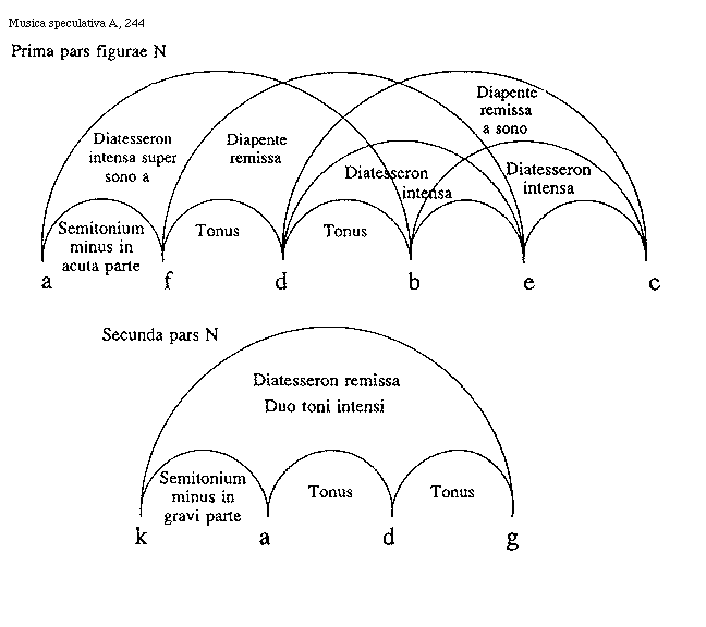 [244][Musica speculativa A, 244; text: Prima pars figurae N, Diapente remissa a sono, Diatesseron intensa super sono a, Semitonium minus in acuta parte, Tonus, a, f, d, b, e, c, Secunda pars N, Diatesseron remissa, Duo toni intensi, Semitonium minus in gravi parte, k, g]