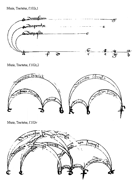 [Muris, Tractatus, f.102r,1; text: diatesseron, diapenthe, diapason, 6, 8, 9, 12, a, b, c, d, e, f, g]