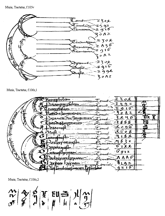 [Muris, Tractatus, f.106r,1; text: Tonus, semitonium, Bis diapason quadrupla proporcio, diapason, diatesseron, A, Proslambanomenos vel prosmelodos, 9216, B, Hypate hypaton, 8192, C, Parhypatehypaton, 7776, D, Licanoshypaton, 6912, E, Hypatemeson, 6144, F, Parhypatemeson, 5832, G, Licanosmeson, 5184, a, Mese, 4608, [sqb], Paramese, 4096, c, Tritediezeugmenon, 3888, d, Paranete diezeugmenon, 3456, e, Nete diezeugmenon, 3072, f, Triteyperboleon, 2916, g Paraneteyperboleon, 2592, aa, Neteyperboleon, 2304, [Mu], [Lambda], [Upsilon], [Epsilon], [Phi], [Zeta]]