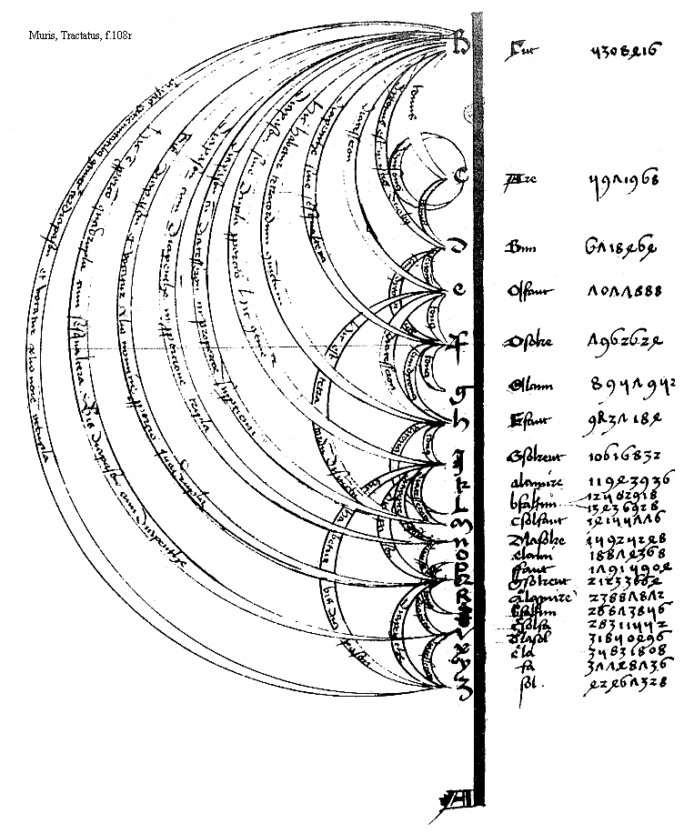 [f.108r][Muris, Tractatus, f.108r; text: A, B, [Gamma]ut, 5308416, C, Are, 5971968, d, Bmi, 6718464, e, Cfaut, 7077888, f, Dsolre, 7962624, g, Elami, 8957952, h, Ffau,t 9437184, I, Gsolreut, 10616832, k, alamire, 11943936, L, bfa[sqb]mi, 12582918, 13436928, m, csolfaut, 14155776, n, dlasolre, 15925248, o, elami, 18874368, p, ffaut, 17915904, Q, gsolreut, 21233664, R, aa lamire, 23887872, S, bb fa[sqb]mi, 26873856, T, cc solfa, 28311552, V, dd lasol, 31850496, X, ee la, 34831808, Y, fa, 37748736, Z, sol, 42467328, vnisonus, tonus, semitonium, semidytonus, dytonus est in istis duobus, diatesseron, tritonus, diapenthe, diapente sesqualtera, diapenthe siue sesqualtera, hic est tetracordum disiunctum, hic habetur bis diapason, hic habetur tetracordum coniunctum, diapason siue dupla proporcio hic continetur, diapason cum diatesseron in proporcione superparcienti, diapason cum diapenthe in proporcione tripla, Bis diapason et vocatur alio nomine proporcio quadrupla, Hic est proporcio quadrupla cum sesqualtera. id est Bis diapason cum diapenthe, In istis extremitatibus continet ter diapason et vocatur alio nomine octupla]