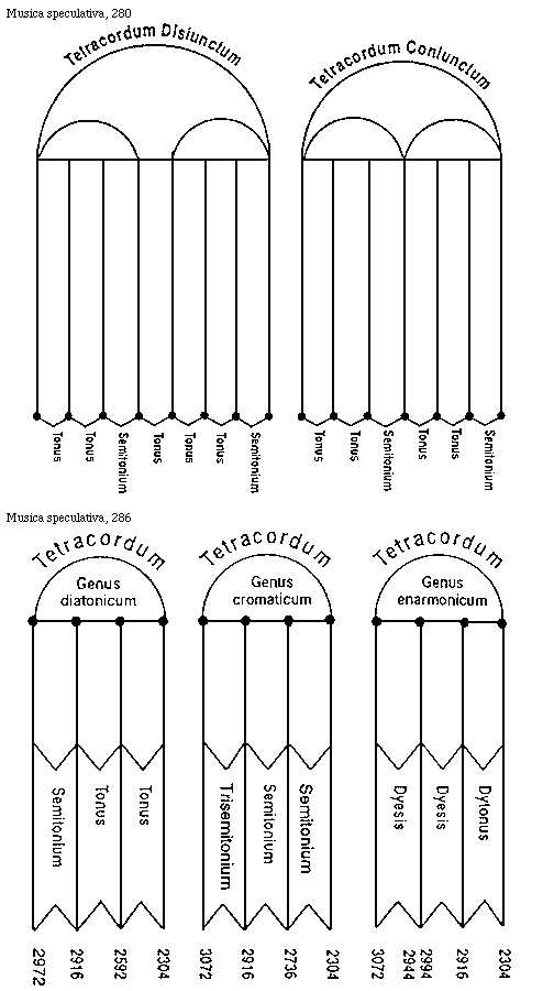 [274]Omne autem tetracordum vocant musici spacium duorum tonorum cum semitonio minori, et hoc est dyatessaron, et racionabiliter ut monstratur. Nam ut in precedentibus est ostensum, bis dyapason ad semel reducitur dyapason; dyapason autem et dyapenthe cum dyatessaron; dyapenthe autem dyatessaron presupponit. Et hec omnia sunt superius manifestata. Dyatessaron autem nullam consonanciam presupponit, sed tonum et semitonium. Huic est quod unanimiter omnes musici tam veteres quam novi primum tetracordum dyatessaron esse concesserunt, quoniam quilibet tonus duas cordas requirit et similiter semitonium duas.