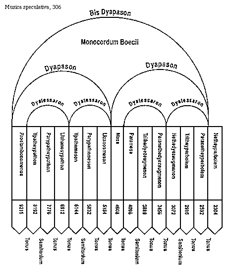 [304]Quocumque autem modo fiat, nunquam proporcio variatur. Sed tamen primitus ego ponam divisionem monocordi dyatonici secundum Boecium, in quo non est nisi bis dyapason. Quantum ad proporcionem numerorum licet ei non repugnet ter vel quater dyapason.