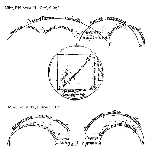 [Milan, Bibl. Ambr., H.165inf., f.12r; text: Diapente intensa, Diapente remissa, Diatessaron acuta aut intensa, Diapente grauis aut remissa, tonus in parte remissa, tonus in parte acuta, b, d, c, f, 192, 216, 288]