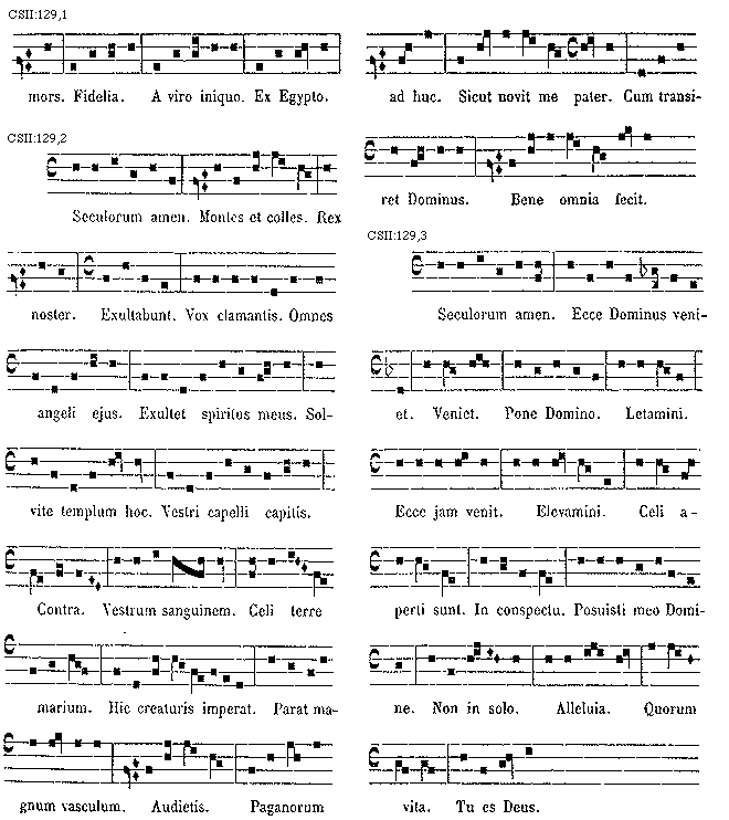 [CSII:129,3; text: Seculorum amen. Ecce Dominus veniet. Veniet. Pone Domino. Letamini. Ecce jam venit. Elevamini. Celi aperti sunt. In conspectu. Posuisti meo Domine. Non in solo. Alleluia. Quorum vita. Tu es Deus.]