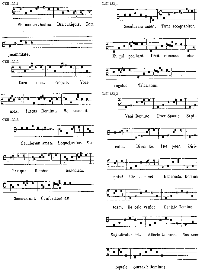 [CSII:129,2; text: Seculorum amen. Montes et colles. Rex noster. Exultabunt. Vox clamantis. Omnes angeli ejus. Exultet spiritus meus. Solvite templum hoc. Vestri capelli capitis. Contra. Vestrum sanguinem. Celi terre marium. Hic creaturis imperat. Parat magnum vasculum. Audietis. Paganorum ad huc. Sicut novit me pater. Cum transiret Dominus. Bene omnia fecit.]