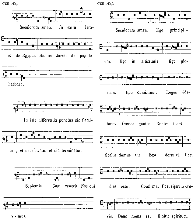 [CSII:140,1; text: Seculorum amen. In exitu Israel de Egypto. Domus Jacob de populo barbaro. In ista differentia punctus sic flectitur, et sic elevatur et sic terminatur. Sapientia. Cum venerit. Nos qui vivimus.]