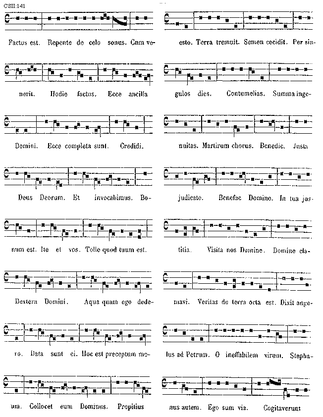 [141][CSII:141; text: Factus est. Repente de celo sonus. Cnm venerit. Hodie factus. Ecce ancilla Domini. Ecce completa sunt. Credidi. Deus Deorum. Et invocabimus. Bonum est. Ite et vos. Tolle quod tuum est. Dextera Domini. Aqua quam ego dedero. Data sunt ei. Hoc est preceptum meum. Collocet eum dominus. Propitius esto. Terra tremuit. Semen cecidit. Per singulos dies. Contumelias. Summa ingenuitas. Martirum chorus. Benedic. Justa judicate. Benefac Domine. In tua justitia. Visita nos Domine. Domine clamavi. Veritas de terra orta est. Dixit angelus ad Petrum. O ineffabilem virum. Stephanus autem. Ego sum via. Cogitaverunt]