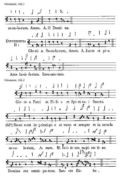 [166][Odorannus, 166,1; text: seculorum, Amen. Antiphona O Domine. Differentia II: Gloria. Seculorum, Amen. Juste et pie. Ante luciferum. Invocantem.]
