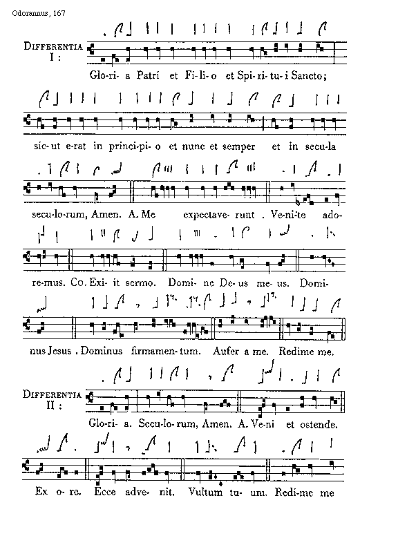 [Odorannus, 167; text: Differentia I: Gloria Patri et Filio et Spiritui Sancto; sicut erat in principio et nunc et semper et in secula seculorum, Amen. Antiphona Me expectaverunt. Venite adoremus. Communio Exiit sermo. Domine Deus meus. Dominus Jesus. Dominus firmamentum. Aufer a me. Redime me. Differentia II: Gloria. Seculorum, Amen. Veni et ostende. Ex ore. Ecce advenit. Vultum tuum. Redime me]