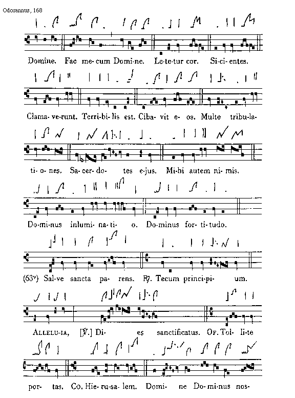 [168][Odorannus, 168; text: Domine. Fac mecum Domine. Letetur cor. Sicientes. Clamaverunt. Terribilis est. Cibavit eos. Multe tribulationes. Sacerdotes ejus. Mihi autem nimis. Dominus inluminatio. Dominus fortitudo. (63v) Salve sancta parens. Responsorium Tecum principium. Alleluia, Versus Dies sanctificatus. Offertorium Tollite portas. Communio Hierusalem. Domine Dominus noster]