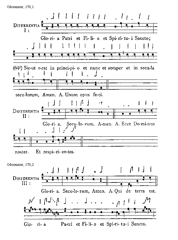 [Odorannus, 170,1; text: Differentia I: Gloria Patri et Filio et Spiritui Sancto; (64r), Sicut erat in principio et nunc et semper et in secula seculorum, Amen. Antiphona Unum opus feci. Differentia II: Gloria. Seculorum, Amen. Ecce Dominus noster. Et respicientes. Differentia III: Gloria. Seculorum, Amen. Antiphona Qui de terra est.]