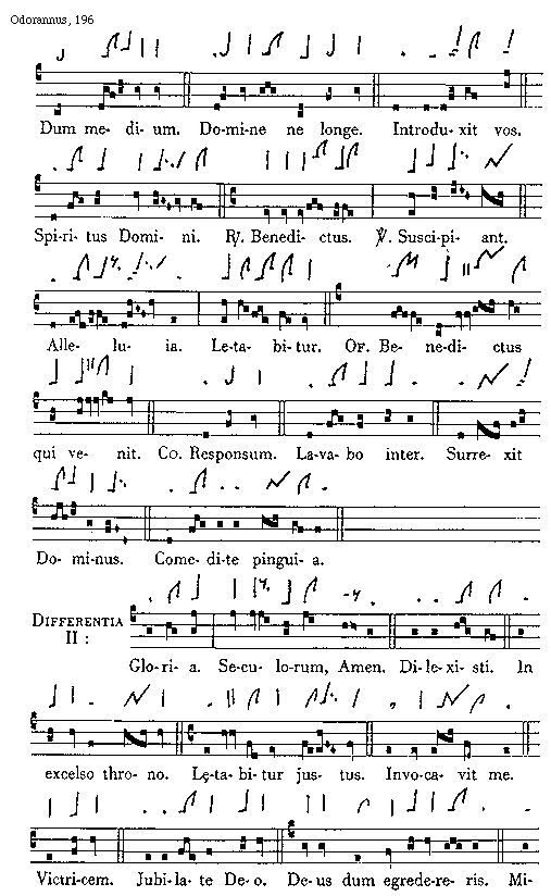 [196][Odorannus, 196; text: Dum medium. Domine ne longe. Introduxit vos. Spiritus Domini. Responsorium Benedictus. Versus Suscipiant. Alleluia. Letabitur. Offertorium Benedictus qui venit. Communio Responsum. Lavabo inter. Surrexit Dominus. Comedite pinguia. Differentia II: Gloria. Seculorum Amen. Dilexisti. In excelso throno. Laetabitur justus. Invocavit me. Victricem. Jubilate Deo. Deus dum egredereris. Miserere]