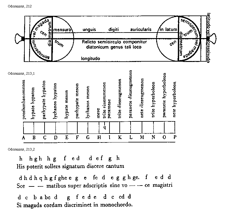 [213][Odorannus, 213; text: A, B, C, D, E, F, G, H, I, K, L, M, N, O, P, proslambanomenos, hypate hypaton, parhypate hypaton, lychanos hypaton, hypate meson, parhypate meson, lychanos meson, mese, trite sinemmenon, paramese, trite diezeugmenon, paranete diezeugmenon, nete diezeugmenon, trite hyperboleon, paranete hyperboleon, nete hyperboleon, h, g, f, e, d, q, c, a, b, His poterit sollers signatum discere cantum, Scematibus super adscriptis sine voce magistri, Si magada cordam discriminet in monochordo.]
