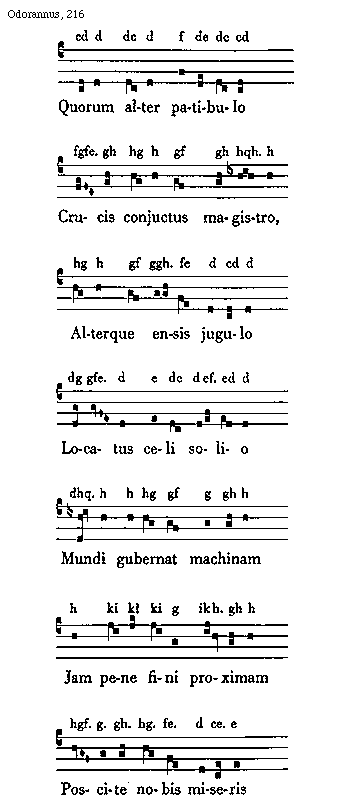 [216][Odorannus, 216; text: c, d, e, f, g, h, i, k, l, q, Quorum alter patibulo, Crucis conjuctus magistro, Alterque ensis jugulo, Locatus celi solio, Mundi gubernat machinam, Jam pene fini proximam, Poscite nobis miseris]