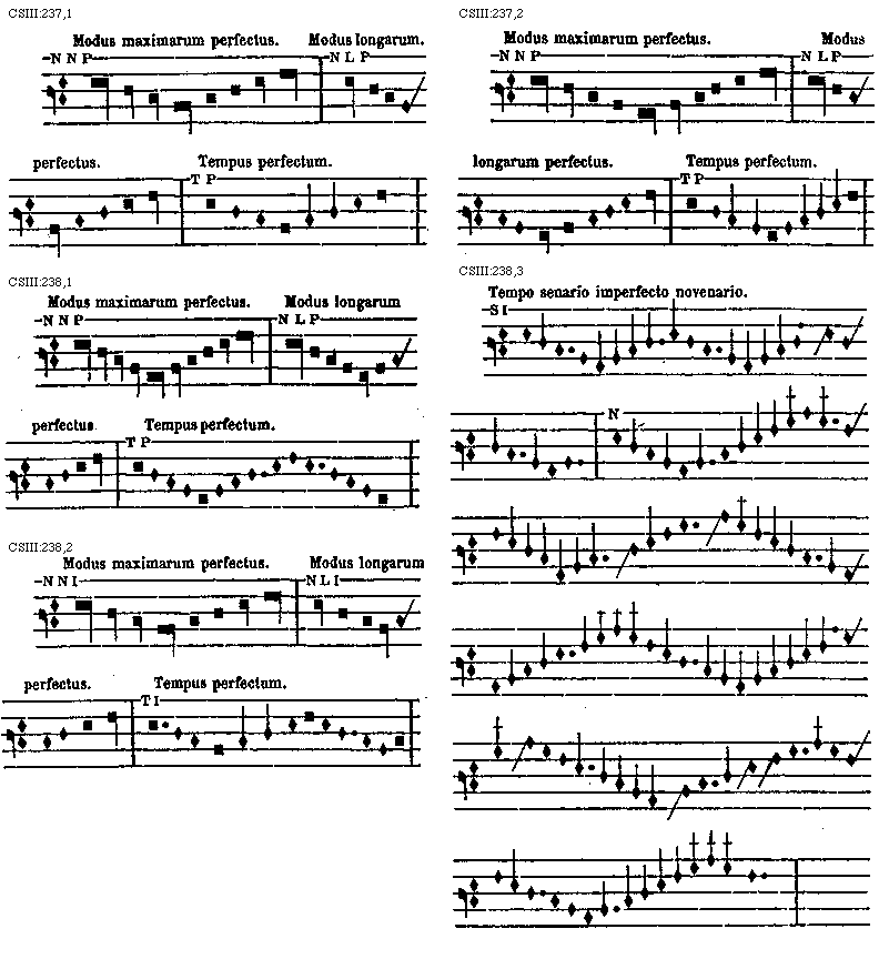 [CSIII:238,1; text: Modus maximarum perfectus,NNP; Modus longarum perfectus,NLP; Tempus perfectum,TP]