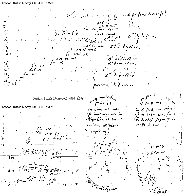 [London, British Library, Add. 4909, f.28r; text: [Gamma] ut, A re, B mi, C fa ut, D sol re, e la mi, f fa ut, g sol re ut, a la mi re, b fa [sqb] mi, c sol fa ut, d la sol re, c sol fa, d la sol]