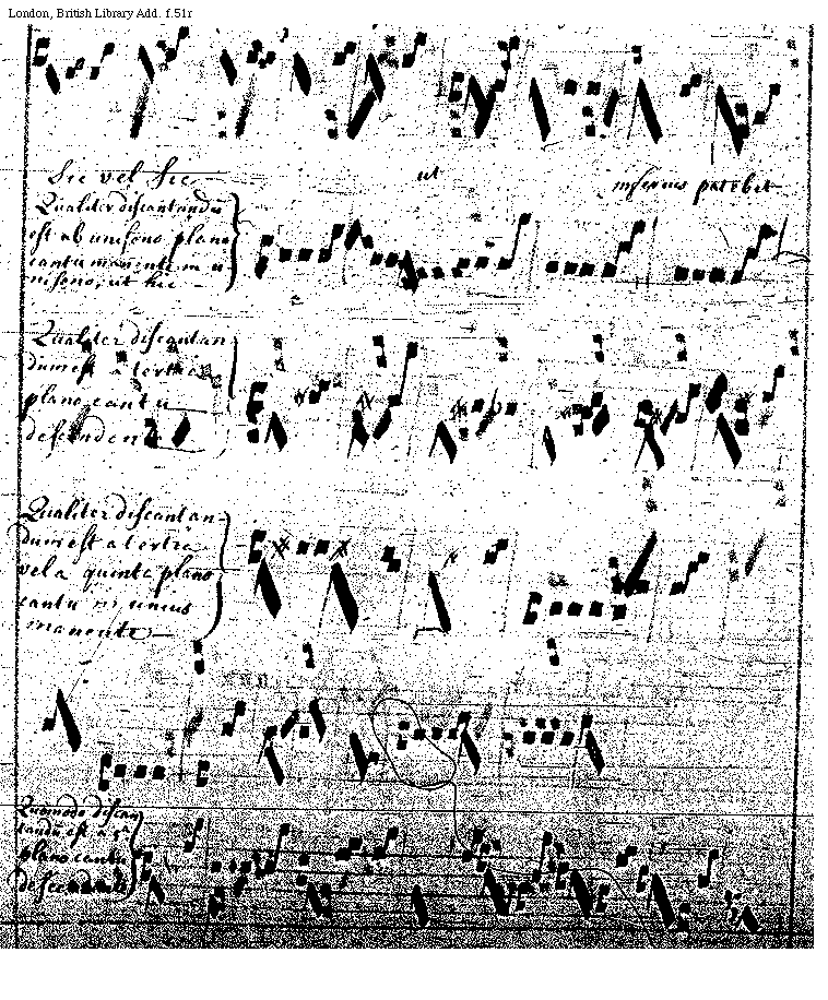 [f.51v][London, British Library, Add. f.51v; text: Quomodo discantandum est a sexta plano cantu in eodem manente, ut hic, Qualiter discantandum est ab octavo voce plano cantu descendente sive in eodem manente, Quomodo discantandum est a decima nota plano cantu in eodem manente sive descendente. Et notandum quod decima nota et tertia sunt ejusdem natura tam in ascendente quam in descendente, ut patet in tertio principali. Quomodo discantandum est duodecima nota plano cantu descendente sive in eodem manente, ut hic, Qualiter discantandum est a tertiadecima sive quintadecima nota plano cantu in eodem manente sive descendente]