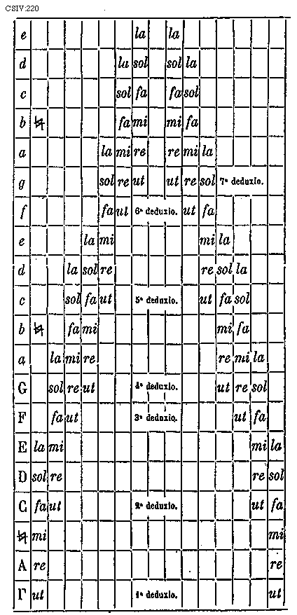 [CSIV:220; text: [Gamma], A, [sqb], C, D, E, F, G, a, b, c, d, e, f, g, ut, re, mi, faut, solre, lami, solreut, lamire, fami, solfaut, lasolre, solfa, lasol, la, solla fasol, mifa, remila, utresol, utfa, mila, resolla, utfasol, resol, prima deduxio, secunda deduxio, tertia deduxio, quarta deduxio, quinta deduxio, sexta deduxio]