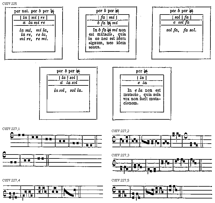 [225][CSIV:225; text: per nat. per b per [sqb], la mi re, a la mi re, la mi, mi la, la re, re la, mi re, re mi; per b per [sqb], fa mi, b fa [sqb] mi, In b fa [sqb] mi non est mutacio, quia in eo nec est idem signum, nec idem sonus; per b per [sqb], sol fa, c sol fa, sol fa, fa sol; per b per [sqb], la sol, d la sol, la sol, sol la; per [sqb], la, e la, In e la non est mutacio, quia sola vox non facit mutacionem.]