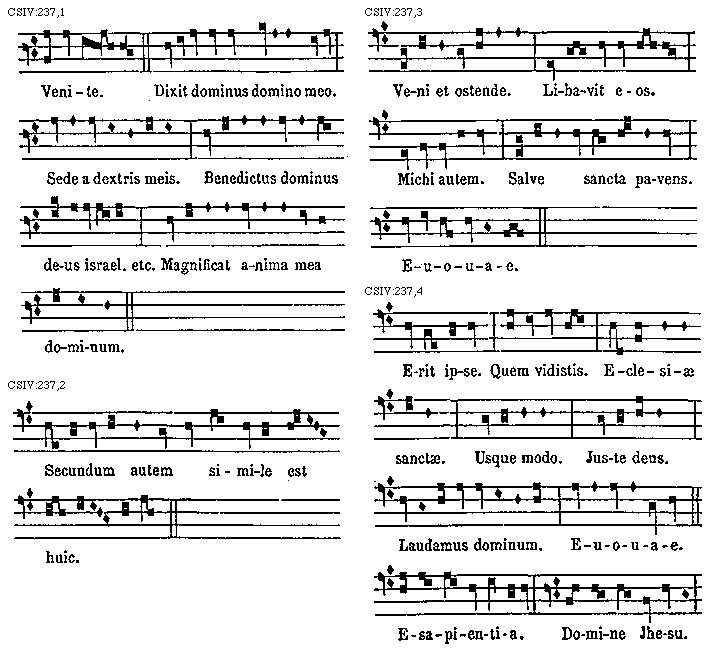 Praeterea si in loco supradicto mutatio fiat et descensio fit in F gravem. antequam ascendatur ad c acutam vel d aut e acutas post mutationem, per b molle in b acuto cantari oportet, ut patet in sequentibus ac consimilibus neupmatibus. Exceptis deutro et tetrardo et ejus plagali, in quibus b molle non intrabit.