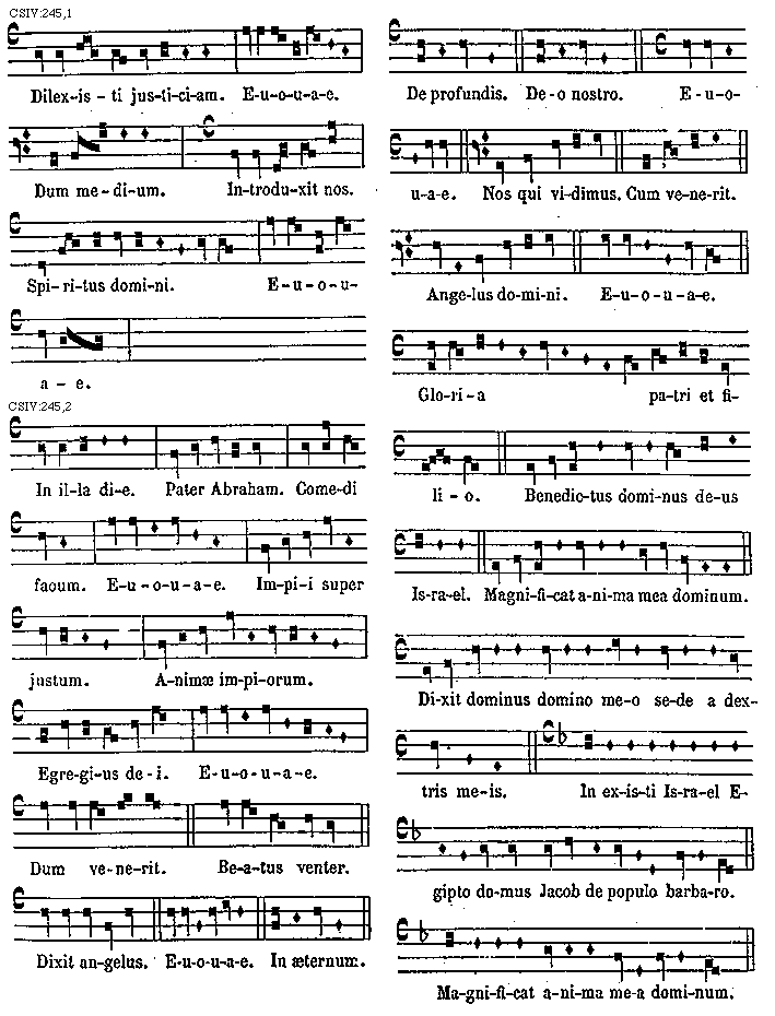 Praeterea tetrardi cantus b molle minime recipit, nec etiam in plaga tetrardi cantum, b molle intrat, quod et sic similis esset in omnibus plagae triti. Unde sciendum est quod [sqb] quadrata in tetrardo et in ejus plagali principatum tenet. Ut autem singulorum modorum elevationes et depositiones a finali regulares breviter demonstretur, ut, si quis modus [sqb] quadratum, et quis modus, b rotundam, ac quis modus utrumque recipit, subscripta formula insinuat.