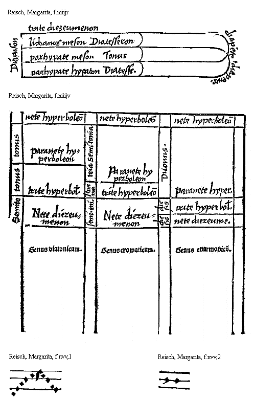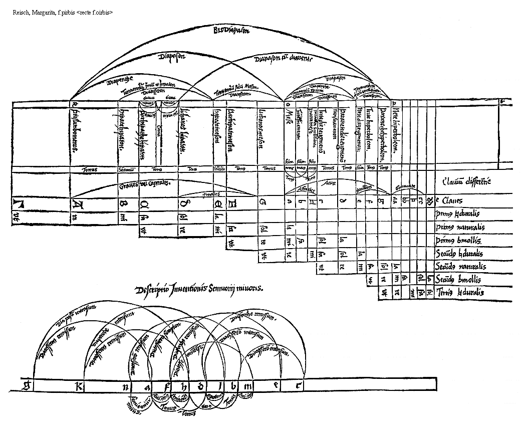 [f.pirbis recte f.oirbis][Reisch, Margarita, f.pirbis recte f.oirbis; text: BisDiapason, Diapason cum diapente, Diapenthe, Tetracordum primum et hipaton, Diatesseron, Tetracordum secundum Meson, Semitonium maius, minus, coma, tertium, quartum excellentium, proslambomenos. hipatehipaton. parhipathehipaton, lichanos hipaton. hipatemeson, parhipatemeson, lichanosmeson, Mese, Tritesinemenon, paramese, paranete sinemenon, Tritediezeugmenon, Netesinemenon, paranetediezeugmenon, Netediezeugmenon. Tritehiperboleon. Paranethehiperboleon, Netehiperboleon. Clauium differentie, Claues, primus [sqb] duralis, naturalis, bmollis, Secundus, Tertius, vt, re, mi, fa sol, la, Graues vel Capitales, finales, Affinales, Acute, excellentes, Germinate, [Gamma], A, B, [sqb], C, D, E, F, G, a, b, [sqb][sqb], c, d, e, f, g, aa, bb, cc, dd, e, Descriptio Inuentionis Semitonij minoris. Diapason intensum, Diatesseron remissum, diapenthe, sumptum, semitonium minus, tonus, apotome, g, k, n, a, f, h, d, l, b, m, e, c]