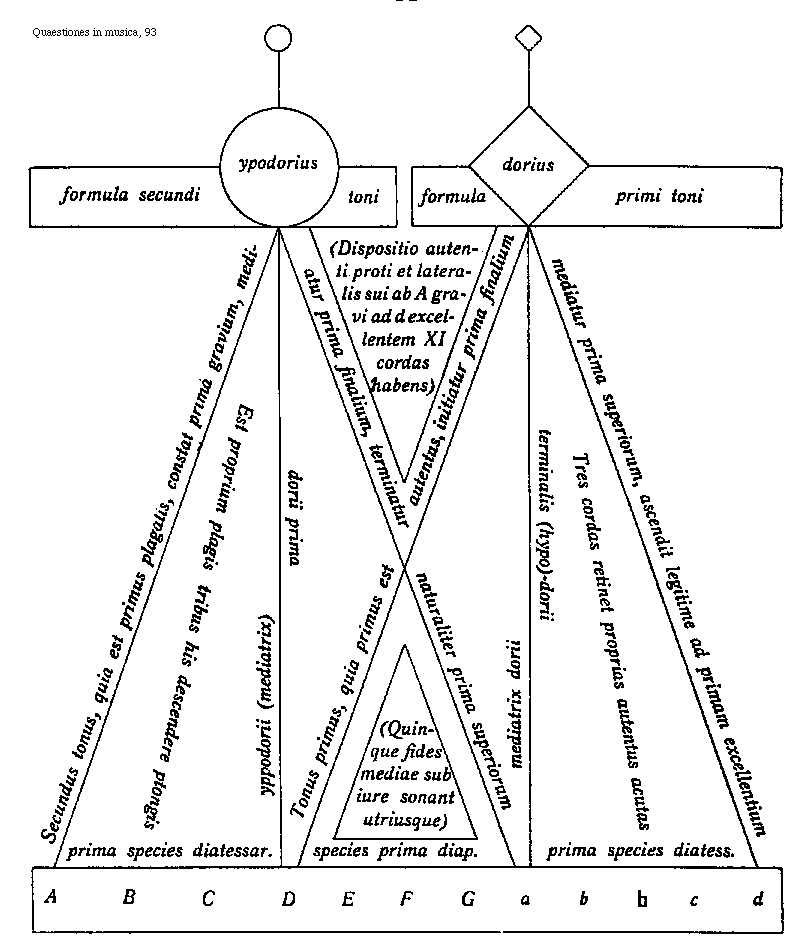 [Quaestiones in musica, 93; text: formula secundi toni, ypodorius, formula primi toni, dorius, (Dispositio autenti proti et lateralis sui ab A gravi ad d excellentem XI cordas habens), Secundus tonus, quia est primus plagalis, constat prima gravium, mediatur prima finalium, terminatur naturaliter prima superiorum, Tonus primus, quia primus est autentus, initiatur prima finalium mediatur prima superiorum, ascendit legitime ad primam excellentium, Est proprium plagis tribus his descendere ptongis, yppodorii (mediatrix), dorii prima, mediatrix dorii, terminalis (hypo)-dorii, Tres cordas retinet proprias autentus acutas, prima species diatessaron, species prima diapason, (Quinque fides mediae sub iure sonant utriusque), A, B, C, D, E, F, G, a, b, [sqb], c, d]